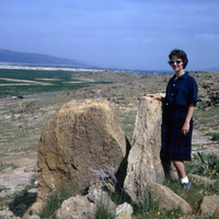 Jordan. Damiyeh dolmen field, Lounette Nicol at roofless dolmen