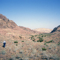 Jordan. Petra, helicopter flight with Jane Taylor down to Wadi Sabra, Jane Taylor