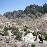 Jordan. Petra, helicopter flight with Jane Taylor down to Wadi Sabra, Jane Taylor and Bdoul guide