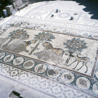 Jordan. Umm ar-Rasas, mosaics in apse of church with northward collapse
