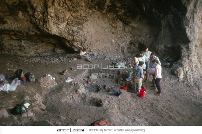 Jordan. Iraq ed-Dubb cave on south side of Wadi Yabis. View of interior of cave to west. Adele Tempest, Enzo Bellotti, Ruba Kana'an, Yacoub Oweis, unidentified female, Gaetano Palumbo, Ian Kuijt, Lori Phillips. Excavation of PPNA remains by Ian Kuijt