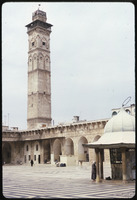فناء جامع حلب الكبير تظهر فيه المئذنة ونافورة الوضوء