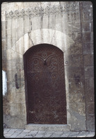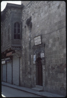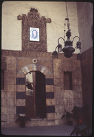 باب في وسط إيوان بيت أجقباش في حي الجديدة، يظهر أعلاه ملصق حافظ الأسد