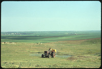 مزارع يسقى المحاصيل بإستخدام الجَرَّار