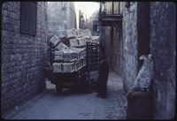 طفل بجانب شاحنة صغيرة تنقل كراسي القش في أحد أزقة دمشق