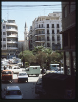 منظر عام لمئذنة جامع تنكز وسط عدد من المباني الحديثة