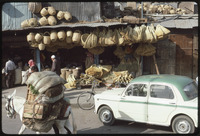 واجهة محل يبيع سلال من الخيزران وحمار يجرّ بضائع في الشارع