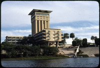 منظر لمحطة كهرباء السد العالي في أسوان مع النصب التذكاري السوفيتي في الخلفية