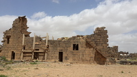 Jordan. Umm al Jimal, facade of Praetorium, large central doorway in middle (behind scaffolding), and two side doors, a typical Roman doorway treatment