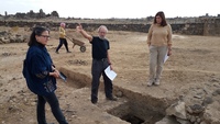 Jordan. Umm al Jimal, excavation of the Commodus Gate, ACOR director Barbara Porter, Bert de Vries, Huda Kilani of USAID SCHEP, local worker in background