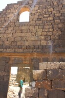 Jordan. Umm al Jimal, the West Church, Maria Trogolo walking through doorway