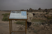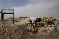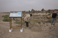 Jordan. Umm al Jimal, worker with pick levelling the ground to insert the Quarry Reservoir interpretive sign
