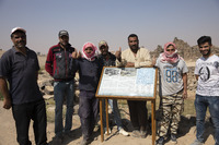 Jordan. Umm al Jimal, workers, foreman Ali Al Masaeed, Na'el Aqeel Al Masaeed, other local workers, and site steward Jehad Suleiman on far right, in front of Quarry Reservoir interpretive sign