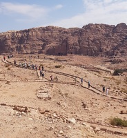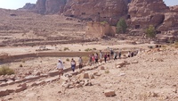 الأردن. البترا، فريق عمل الدراسة الإحصائية لتتبع زوار معبد الأسود المجنحة، يظهر في الصورة زوار في الممرات إلى المعبد