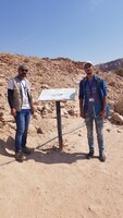 الأردن. البترا، فريق عمل الدراسة الإحصائية لتتبع زوار معبد الأسود المجنحة أمام إحدى اللوحات التفسيرية التي تم تركيبها بدعم من المركز الأمريكي للأبحاث من خلال مشروع استدامة الإرث الثقافي بمشاركة المجتمعات المحلية