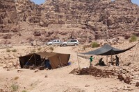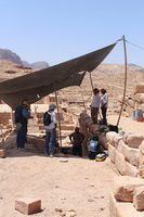 Jordan. Petra, Temple of the Winged Lions, shade used for documentation work, pictured: Franco Sciorilli and team members