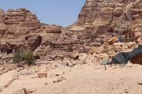 Jordan. Petra, Temple of the Winged Lions, facing south towards Great Temple with path, project tent, Great Temple in background, lapidarium