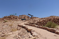Jordan. Petra, Temple of the Winged Lions, sifting station on east side of temple, lapidarium in foreground (architectural stone gallery), east wall, Umm al Biyara in background