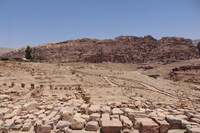 Jordan. Petra, Temple of the Winged Lions, lapidarium (architectural stone gallery) in foreground, Royal Tombs in background