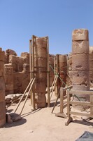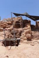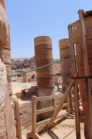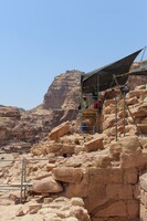 Jordan. Petra, Temple of the Winged Lions, scaffolding and shade, team members working by pronaos on the south side of temple