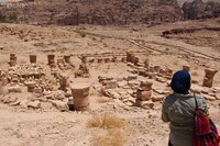Jordan. Petra, Temple of the Winged Lions, southeast quadrant, facing east, showing TWL team member and Royal Tombs in background