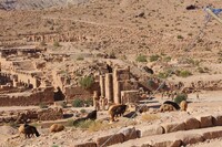 Jordan. Petra, Temple of the Winged Lions, sheep grazing on site, Great Temple in background
