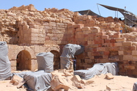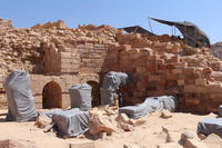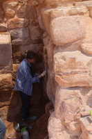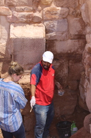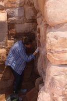 Jordan. Petra, Temple of the Winged Lions, southwest quadrant, team member wrapping architectural elements in geotextile to protect them prior to backfilling