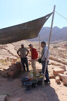 Jordan. Petra, Temple of the Winged Lions, Ahmad Mowasa (in red) and other team members under shade with conservation materials