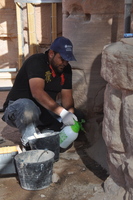 Jordan. Petra, Temple of the Winged Lions, Hamza Wakyan applies final layer of mortar over cella podium
