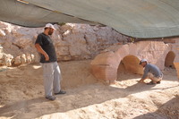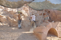 Jordan. Petra, Temple of the Winged Lions, cobble layer for southwest quadrant backfilling / buttress, team members using a hoe