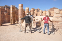 Jordan. Petra, Temple of the Winged Lions, team members placing rope barriers in front of temple podium