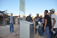 Jordan. Petra, Temple of the Winged Lions, school visit, in front of signage
