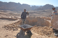 Jordan. Petra, Temple of the Winged Lions, team member working with wheelbarrow for backfilling of southwest quadrant