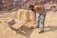 Jordan. Petra, Temple of the Winged Lions, team member shoveling sand into a wheelbarrow for backfilling of southwest quadrant