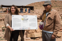 Jordan. Petra, Temple of the Winged Lions, Miriam Saleh holds up one of the eight graphic panels that she designed for TWL, with Franco Sciorilli at marking event