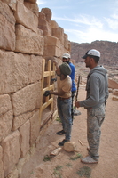 Jordan. Petra, Temple of the Winged Lions, path build-out completed, with course sand added to bank in front of cella, fence posts installed, team members