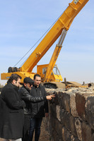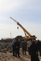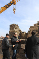Jordan. Umm al Jimal, crane for restoration activities, Nizar Al Adarbeh, Jehad Haron, visitor