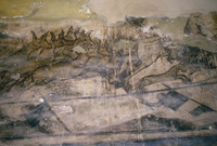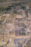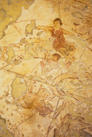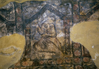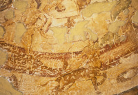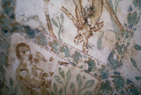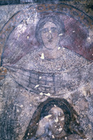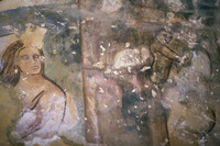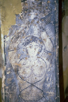 Jordan. Qusayr Amra, torso of the female figure holding the medallion with the portrait of the caliph or prince on the soffit of the east arch of the great hall