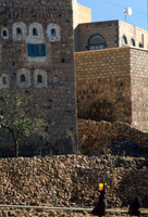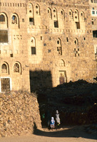 Yemen. Shaharah houses and women carrying water