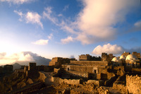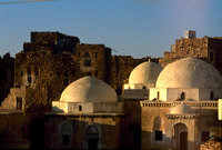 Yemen. Shaharah mosque and houses in evening light
