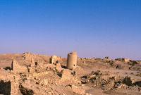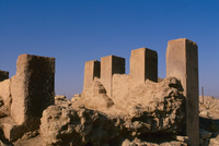 Yemen. Baraqish, Islamic building and ancient columns inside walls