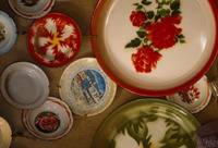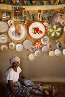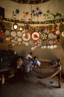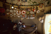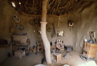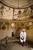 Yemen. Mahal al-Ha'arib, Tihama, enamel plates decorate thatched house interior
