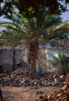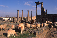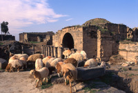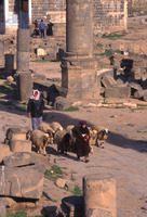 Syria. Bosra, women and sheep, four columns of nymphaeum