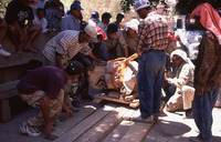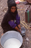 Petra, Bdoul bedouin woman making butter in goat skin; Mughar an-Nasara