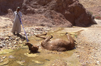 Camel trek, camel wallows in stream at Tur Imdai