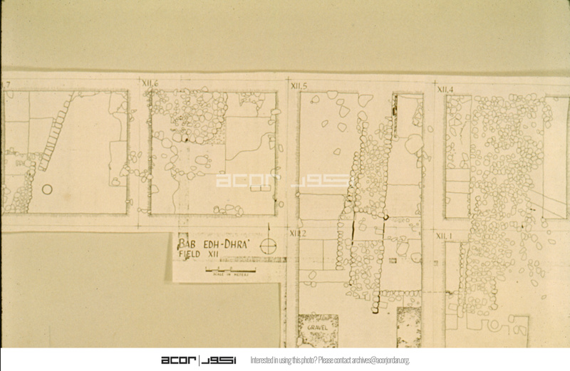 الأردن. موقع بلدة باب الذراع، الحقل الثاني عشر، مخطط من أعلى لأسفل يتضمن معبدا وساحة فناء من أوائل العصر البرونزي الثالث