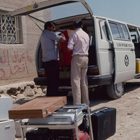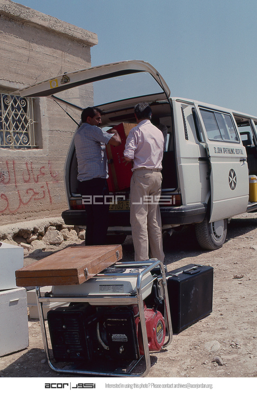 Palestine. West Bank, Unloading St John Ophthalmic Hospital minibus on Outreach visit to Auja refugee camp near Jericho