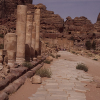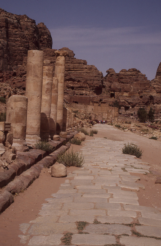 Jordan. Petra, the Colonnaded street inside Petra, showing the typical curved surface and regular blocks of paved Roman streets
