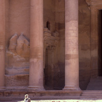 Jordan. Petra, Khazneh, lower order, south (left) man with camel
