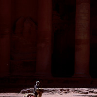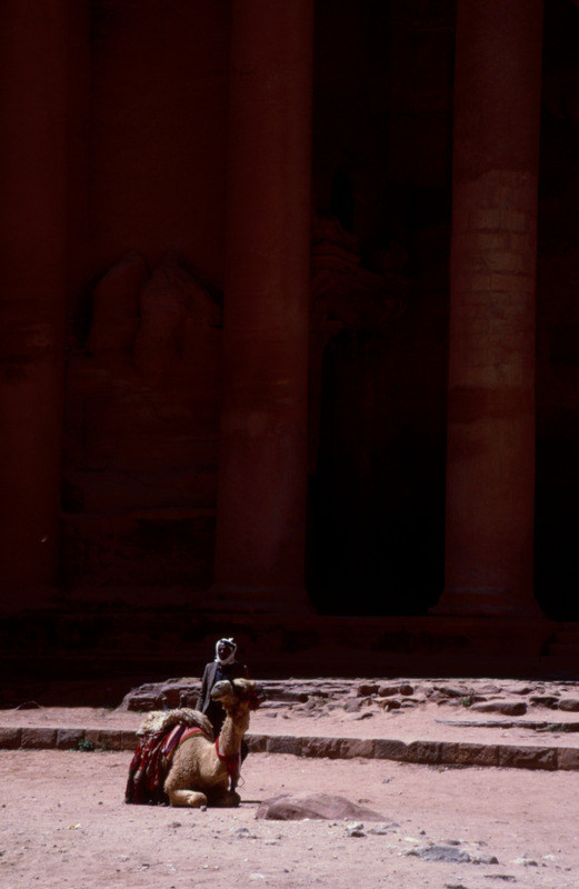 Jordan. Petra, Khazneh, lower order, south (left) man with camel